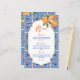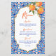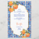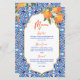 Sie fand ihr Haupt Squeeze Brautparty blauen orange Menü-Karte Vorlage, blau Majjolica spanischen mediterranen Fliesen Haufen von Orangen mit modernen lässigen Drehbuch, schön für den Sommer Outdoor-Funktionen personalisierte Menükarten.
