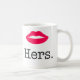 Eine lustige Kaffee-Tasse, die das Wort "ihrs" in einem Set hellen rosa Lippen über ihm kennzeichnet.