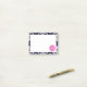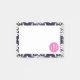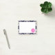 Ein Geschenk, das in der Mitte mit dem Monogramm in rosa Kreis personalisiert werden kann. Hintergrund ist marineblau und weiß kat Muster.