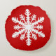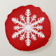 Ein empfindliches, Spitzen- Schneeflockemuster auf einem festen Hintergrund mit einem gestreiften, Ikat gesponnene Beschaffenheit - weiße Schneeflocken auf einem dunklen runden Kissen des Weihnachtsroten/hochroten Hintergrundes