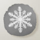 Ein zartes, schnörkelloses Schneeflockenmuster auf einem soliden Hintergrund mit gestreifter, Ikat gewebter Textur - weiße Schneeflocken auf einem kohle-/grau/grauem Hintergrund, rundliches Kissen
