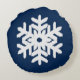 Ein zartes, schnörkelloses Schneeflockenmuster auf einem soliden Hintergrund mit gestreiften Ikat-Geweben - weißer Schneeflocke auf einem dunkelmarinierten/indigoblauen Hintergrund, rundes Kissen