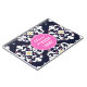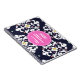 Ein Geschenk, das mit Ihrem Monogramm innerhalb des rosa Kreises in der Mitte personalisiert sein kann. Hintergrund ist Marineblau und -WEISS ikat Muster.