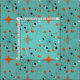 Stilvoll auf dem Trend inspiriert durch Retro-Design Mitte des Jahrhunderts mit atomaren Sternexplosionen auf einem weißen Korbgeflecht in Orange-, Grau-, Türkis-, Schwarz-Weiß-Tönen