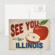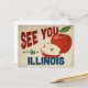 Eine bezaubernde Illinois Vintage Reise-Postkarte mit einem schönen roten Apfel, zusammen mit lustigen Retro-Text, der sagt: "See you in Illinois"
