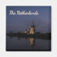 Souvenir Foto Magnet mit beleuchteten historischen Windmühlen mit Reflektion im Wasser des Flusses während der Blauen Stunde am Anfang der Nacht in Kinderdijk in den Niederlanden mit dem Text: 'The Netherlands'.