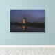 Leinwand Landschaftsbild von beleuchteten historischen Windmühlen mit Reflektion im Wasser des Flusses während der Blauen Stunde am Anfang der Nacht in Kinderdijk in den Niederlanden. Eine tolle Dekoration an der Wand!