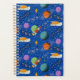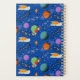 This hand-drawn spiral planner covers 12 months of weekly and monthly planning space in a small 5.5" x 8.5" format, with a cobalt blue cover packed with ringed planets, textured orbs, red rockets, asteroid clusters, four-pointed gold stars, constellation lines, and a sleepy fox drifting through clouds. The pattern came out of living under southern Arizona skies, where the Milky Way shows up on a Tuesday like it's not a big deal. A good fit for anyone who schedules around meteor showers, drives out to Kitt Peak for fun, or just wants their to-do list to feel a little less terrestrial.