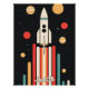 Eine lebendige retro-thematische Abbildung eines klassischen Raketenschiffs, das in den Weltraum abstrahlt, umgeben von farbenfrohen Planeten, Sternen und kosmischen Elementen. Das Design verwendet fette Rottöne, Tees und Orangen vor einem dunkelsternigen Hintergrund, der eine Ski-Fi-Ästhetik aus der Mitte des Jahrhunderts hervorruft. Dieses skurrile und nostalgische Kunstwerk ist ideal für Kinder. Das Beste an diesem Poster ist, dass Sie es mit dem Namen Ihres Kindes anpassen können.