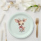 Papier Teller mit einer Illustration eines bezaubernden Hirsches. Große Augen große Ohren mit einem großen Kopf und kleine braune Geweihe. Tragen Sie einen großen roten Bogen.