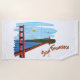 Ein Tuch für jedermann das Lieben San Francisco: dieses Ausrüstungsbeschreibungen eine wunderliche Illustration Golden gate bridges mit San Francisco Bay und der Stadt im Hintergrund. Ein gelbes Flugzeug fliegt über die Brücke, die eine Fahne mit dem Text "Kalifornien" und einem Bild des Bären von der Staatsflagge schleppt. Der Text "San Francisco" erscheint im unteren Recht in einem playful, orange Schriftart, der im Schwarzen umrissen wird.