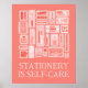 Eine Sammlung von handgezeichnet Korallen- und Rotwerkzeugen, wie Stifte, klebrige Noten, Aquarellpaletten, Waschbänder und vieles mehr, mit einem eigenartigen, aber dennoch herzlichen Satz "Stationery Is Self Care". Dieses Poster feiert die sanfte Magie von Papier, Stiften und friedlichen Momenten. Geeignet für alle, die Freude an einem neuen Notizbuch und friedlichen Journaling Sessions finden. Für diejenigen, deren Lieblingssaisle die Schreibwarensektion ist, die Stifte und Waschbänder wie Schätze sammeln und die Liebe ihre Dot Grid Zeitschrift oder ihren Planer schmücken. Kreative Vorräte sind nicht nur für die Herstellung von Dingen, sondern auch für die Verlangsamung, den Atem nehmen und einen Augenblick des Tages finden. Vielen Dank für die Anzeige eines Eria Daisy Art Design!