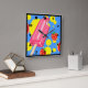 Eine quadratische Uhr mit einem Sommerthema. Entworfen mit einem rosa Popsikel und einigen roten Erdbeeren und gelben Farbspritzen. Blauer Hintergrund.