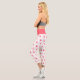 Ein Paar rosa Flamingo gemusterte Capri Leggings. Das Muster zeigt illustrierte Flamingos auf weißem Hintergrund. Die Leggings haben einen rosa Bund, der mit einer Farbe in den Flamingos übereinstimmt.
