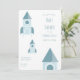 Eine Babydusche mit einer Reihe von blauen Raketenraumschiffen. Die Einladung zeigt weiche blaue Raketen mit entspanntem und luftigem Text. Die Rückseite der Einladung zeigt ein Muster von Raumschiffen. Alle Wörter können angepasst werden.