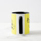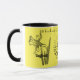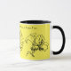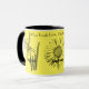 Tasse mit 3 illustrierten Blume auf weichem, gelbem Hintergrund. Und blaue Schmetterlinge aus Lakey. Fügen Sie Ihren eigenen Text hinzu.