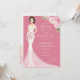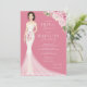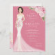 Eine illustrierte Braut, um in einem Hochzeitskittel zu sein und von handgezeichneten Aquarellrosa und Weißrosen und Pfannkuchen umgeben, lädt zum Bräunen ein. Wählen Sie Frisur, Haarfarbe und Hautfarbe, um am ehesten wie die Braut auszusehen. Auf der Rückseite der Einladung stehen Imitate Spitzen und rosa Rosa.