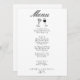 Ein Vintages Retro funky modernes, schwarz-cremefarbenes Abendmenü. Das Design ist schick und bietet einen weißen Hintergrund und schwarze handgeschriebene Typografie. Mit handgezücktem Wein und Champagnerbrille vorne. Und handgezeichneter Kuchen auf der Rückseite. Ein perfekter und passender Rahmen für die ganze Suite.