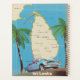 Illustrierte Landkarte von Sri Lanka (mit den umliegenden Inseln) in einem Vintagen, detaillierten Stil, mit einem alten Automobil dekoriert.