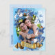 Illustrierte, weiße Mond-Blume in Aquarelltönen mit Vögeln und blau-grüne Blätter auf einem blühenden Foto im Hintergrund, um sich zu personalisieren. Dieses moderne, stationäre Design ist perfekt für jede Feier im Freien in einem Sommergarten wie für eine Hochzeit.