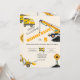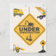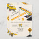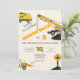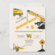 Im Baugewerbe Geburtstagsparty Einladung mit LKW, Krane und Traktor. Niedliche bauliche Party Einladung. Gelb, orange, weiß, schwarz und grau. Geburtstag im Bau Schild auf der Rückseite.
