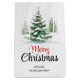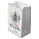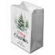 Im Freien Weihnachtsbaum und Schneefall Mittlere Geschenktasche. Dieses Weihnachtsbaumdesign im Freien besticht durch eine atemberaubende Winterlandschaft mit schneebedeckten Bäumen, die alle mit farbenfrohen Weihnachtsdekorationen geschmückt sind. Die Phrase "Frohe Weihnachten" hebt sich hervor, während sanfte graue Schneeflocken sanft in den Hintergrund fallen und das zauberhafte Winterambiente noch verstärken.