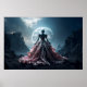 Eine geheimnisvolle Figur in einem aufwändigen Gewand steht vor einem glühenden Vollmond, Set gegen eine dramatische Felslandschaft. Die Szene wird durch den Kontrast zwischen den komplizierten Details des Kleides und dem rauen Gelände verstärkt.