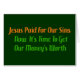Wenn Jesus bereits für unsere Sünden zahlte, könnten wir den Wert unseres Geldes genauso gut erhalten. "Jesus zahlte für unsere Sünden. Jetzt ist es Zeit, den Wert unseres Geldes zu erhalten."