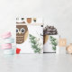 Waldtiere und Pilze bilden das Holiday-Muster mit Hirschen, Eule, Pilzen, Eichen, Fuchs, Kaninchen und Kiefernästen. Niedliches Weihnachtsmuster. Personalisieren Sie den Text, indem Sie ihn ändern.