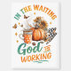 Friedliches, farbenfrohes Design mit Herbst/Herbst-Szene mit Kürbis, Tasse Kaffee, Schmetterlinge und Herbst-Blume. Der farbenfrohe inspirierende Text lautet: "Im gewartet Werk arbeitet Gott". Dieses Design ist auf einer Vielzahl von Produkten erhältlich.