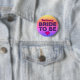 Niedliches Abzeichen Button für Ihr HennenParty. Oben am Abzeichen in rosa Schrift mit einer schwarzen Linie ist der Name der Braut, dies ist eine Vorlage, um den Beispielnamen im Textfeld durch Ihren eigenen zu ersetzen. Unten in lila Text mit einer schwarzen Kontur sind die Wörter Bride To Be. Am unteren Ende des Abzeichens befindet sich ein niedliches rosa Liebe-Herz mit einer schwarzen Kontur, um das Gesamtbild zu beenden. Der Hintergrund ist ein Imitat Glitzer Design in einem Farbverlauf von gelb, rosa und lila.