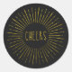 Diese eleganten und eleganten Aufkleber sind eine tolle Ergänzung zu einem Umschlag, laden Sie ein oder passen Sie auf jede formelle Ansammlung. Sie haben einen schwarzen Hintergrund. Auf dem Hintergrund ist ein Kreisbruch mit einem goldenen Effekt von Imitaten. Bitte beachten Sie: Das Gold ist nur ein grafischer Effekt. Es ist eigentlich nicht metallisch. Das Wort "Cheers" sitzt im Berst. Große Sticker für Weihnachten, Neujahr, Hochzeiten, Firmenveranstaltungen & Geschäftstreffen.