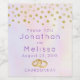 Hochzeitsweinflaschenlabel mit Fake goldenen Konfetti, die oben auf den Sprinkler gestreut werden. 2 goldene Hochzeitsringe unterhalb Ihres personalisierten Textes. Ein blasser lila und gelber Aquarellhintergrund.