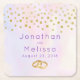 Die Untersetzer aus Papier mit Goldkonfetti aus Fake sprinkletterten oben entlang. 2 goldene Hochzeitsringe unterhalb Ihres personalisierten Textes. Ein blasser lila und gelber Aquarellhintergrund.
