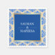 Elegante Servietten aus Hochzeitspapier mit einem goldenen Imitat-Rahmen vor blauem und beigem Damast-Hintergrund.