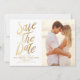 Mit diesem modernen und stilvollen Ankündigung Datum freihalten verkünden Sie Ihre Hochzeit mit Ihrer Familie und Ihren Freunden. Die individuell anpassbare Ankündigung Datum freihalten zeigt Imitate mit Goldfolie fett formatierte Typografie und festliche Punktmuster. Personalisieren Sie die Kartenrückseite, indem Sie Ihr Foto oder andere Muster hinzufügen.