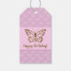 Schöne Schmetterlingform in Imitaten (nicht real) goldgelbe Folie aussehen wie Textur auf einem hellen lila / lavender Farbhintergrund. Der Hintergrund hat auch ein helles Schmetterlingsmuster. Es gibt auch einen personalisierbaren Textbereich, der nun lautet: "Glücklich zum Geburtstag!". HINWEIS: DAS DESIGN IST EIN DIGITALES BILD, DAS AUF DEM PRODUKT DRUCKT WIRD.
