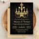 Erleben Sie Ihre Gäste mit dieser eleganten Hochzeitseinladung, die mit einem schönen goldenen Kronleuchter vor einem schwarzen Damast-Hintergrund besticht. Fügen Sie einfach Ihre Veranstaltungsdetails zu dieser einfach zu bedienenden Vorlage hinzu, um sie zu einer einmaligen Einladung zu machen. Dreh die Karte auf, um eine goldene Glitzer-Textur des Imitats auf der Kartenrückseite sichtbar zu machen.