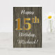 Dieses schlichte Design der Geburtstagskarte zeigt die Meldung "Happy 15 th Birthday", mit dem "15." ein goldfarbenes Imitat. Es verfügt auch über einen benutzerdefinierten Namen und ein Imitat Holz Aussehen Hintergrund. Es könnte jemandem gegeben werden, der seinen fünfzehnten Geburtstag feiert.