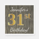 Dieses einfache Papier-Serviettendesign enthält eine Nachricht wie "Jennifers 31. Geburtstag!", mit dem "31.", das ein Imitat in goldenem Aussehen auf einem Imitat-Holzaussehen-Hintergrund hat. Der Name kann personalisiert sein. Es könnte auf einer Geburtstagsfeier für jemanden verwendet werden, der seinen 31. Geburtstag feiert. [~Z0000084]