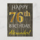 Dieses einfache, personalisierte Geburtstagskartendesign beinhaltet die Meldung "HAPPY 76. BIRTHDAY", die "76." hat ein goldenes Aussehen in Imitaten. Die Vorderseite hat auch einen individuellen Namen und einen Hintergrund für die Holzdarstellung von Imitaten. Auf der Rückseite finden Sie eine individuell anpassbare Geburtstagsnachricht sowie die individuell anpassbare Adresse des Empfängers der Geburtstagskarte. Es könnte jemandem gegeben werden, der seinen sechsundsiebzigsten Geburtstag feiert. [~Z0000066]