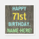 Dieses lustige Geburtstagsparty-Design beinhaltet eine Nachricht wie "HAPPY 71st BIRTHDAY, NAME-HERE!", in der der Name personalisiert sein kann. Der Hintergrund ist mit einem rustikalen, braunen Holzkornmuster aus Imitat gestaltet. Der personalisierte Nachrichtentext weist Farben wie Blau, Gelb und Grün auf und hat ein Aussehen, das durch das Anbringen von gestrichenen, gestrichelten Buchstaben inspiriert wird. Napkins wie diese könnten vielleicht auf einer Geburtstagsparty für jemanden verwendet werden, der seinen siebzigsten ersten Geburtstag feiert. [~Z0000292]