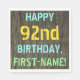 Dieses lustige Geburtstagsparty-Design enthält eine Nachricht wie "HAPPY 92. BIRTHDAY, FIRST-NAME!", in der der Name personalisiert sein kann. Der Hintergrund ist mit einem rustikalen, braunen Holzkornmuster aus Imitat gestaltet. Der anpassbare Text der Nachricht weist Farben wie Blau, Gelb und Grün auf und hat ein Aussehen, das durch das inspirierte, gestrichelte Schriftzeichen ersetzt wird. Neapel wie diese könnten vielleicht auf einer Geburtstagsparty für jemanden verwendet werden, der seinen zweiundneunzig Geburtstag feiert. [~Z0000292]