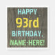 Dieses lustige Geburtstagsparty-Design beinhaltet eine Nachricht wie "HAPPY 93. BIRTHDAY, NAME-HERE!", in der der Name personalisiert sein kann. Der Hintergrund ist mit einem rustikalen, braunen Holzkornmuster aus Imitat gestaltet. Der personalisierte Nachrichtentext weist Farben wie Blau, Gelb und Grün auf und hat ein Aussehen, das durch das Anbringen von gestrichenen, gestrichelten Buchstaben inspiriert wird. Neapel wie diese könnten vielleicht auf einer Geburtstagsparty für jemanden verwendet werden, der seinen dreiundneunzigsten Geburtstag feiert. [~Z0000292]