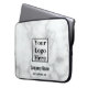 Sie können die Laptop-Ärmel Ihres Unternehmens markieren, indem Sie das Display-Bild durch Ihr Logo ersetzen. Unter Ihrem Logo können Sie auch den Firmennamen und die Webadresse angeben. Der Ärmel hat ein weißes Marmordesign aus Imitat. Der Text ist schwarz.