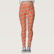 Ein Paar schicke Leggings, mit einem rustikalen Imitat-Flickwerk aus Hexagonen aus beißig orangefarbenen Blüten, orangefarbenen, roten und gelben Streifen und weißen Polka-Punkten auf rotem Hintergrund. Teil der Posh & Painterly "Orange Fizz" Kollektion. Sie können diese Leggings anpassen, indem Sie die Skala der Musterfliese ändern, oder sie rotieren, für ein ganz anderes Aussehen.