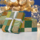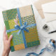 Eine Rolle chic Giftwrap mit einem Imitat Patchwork-Muster aus Stammesmustern, Streifen und Polka-Punkten in Grün, Rusty Red, Navy Blue und Old Gold; aus der Posh & Painterly 'Jungle Drums' Kollektion.