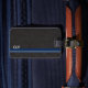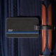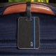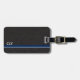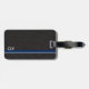 Klassischer Stil mit schwarzem Lederhintergrund und einem einfachen Monogramm mit blauer Linie und kleineren grauen Streifen. Für die Person, die ein einfaches Aussehen will, aber gerne eine einfache Möglichkeit, ihr Gepäck zu identifizieren, ohne alle ihre Informationen. Originelles Design von Night Owl's Menagerie, 2023.