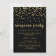 Diese Party Einladung ist glänzend, elegant und bietet Imitate mit goldenen Konfetti und passender Typografie auf schwarzem Hintergrund.