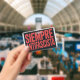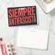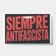 Dieses Bild zeigt ein kraftvolles politisches Schlagwort auf Spanisch, "SIEMPRE ANTIFASCISTA," vor einem kahlen schwarzen Hintergrund. Der Text, der "ALWAYS ANTIFASCIST" bedeutet, ist in einer fetten, abgenutzten roten Schriftart dargestellt, was ein festes und dauerhaftes Bekenntnis zum Antifaschismus suggeriert. Es ist eine auffallende visuelle Aussage ideologischer Solidarität und Opposition gegen faschistische Ideologien